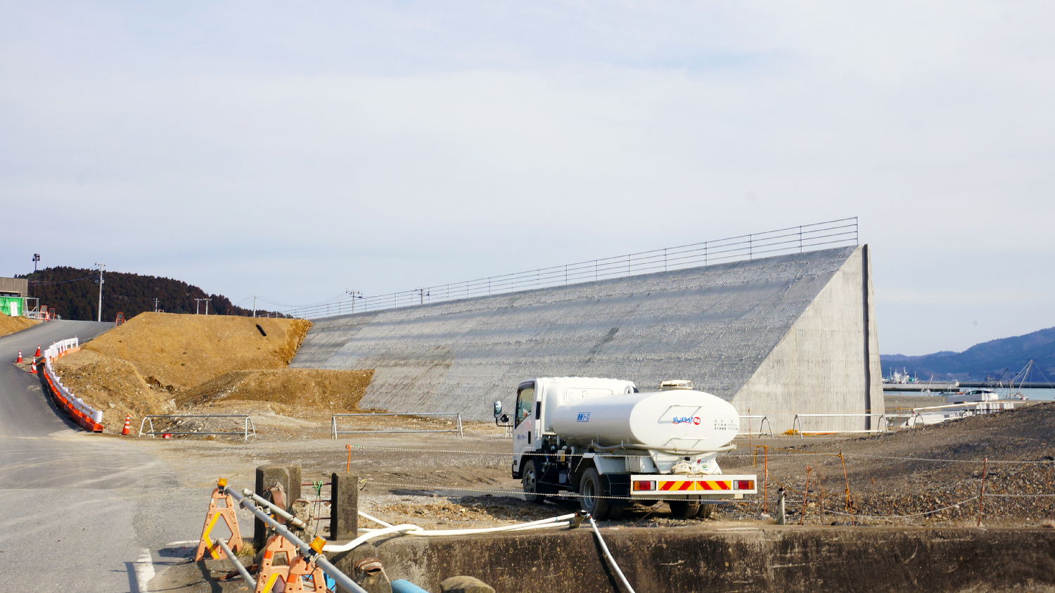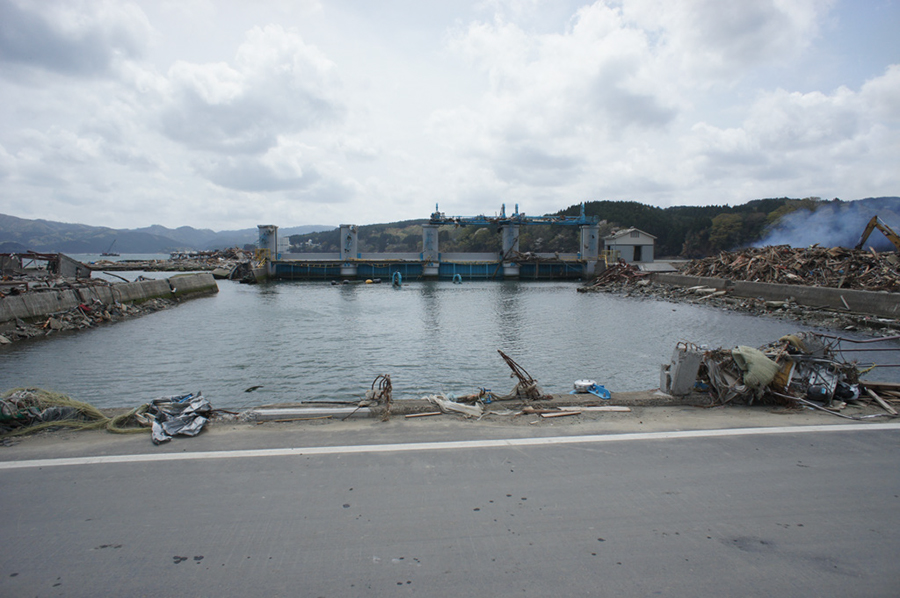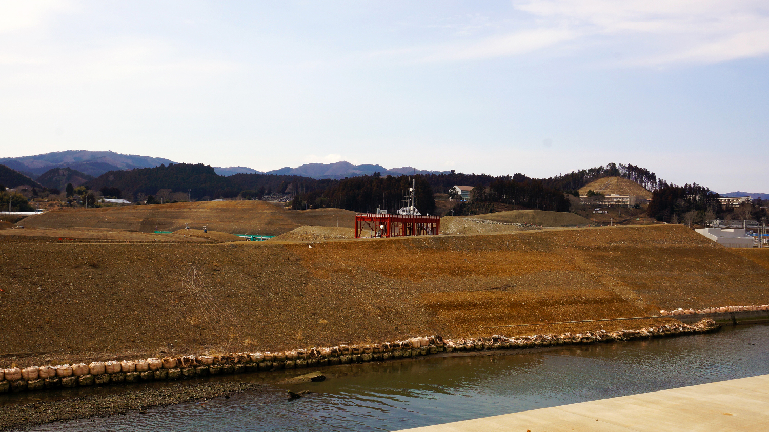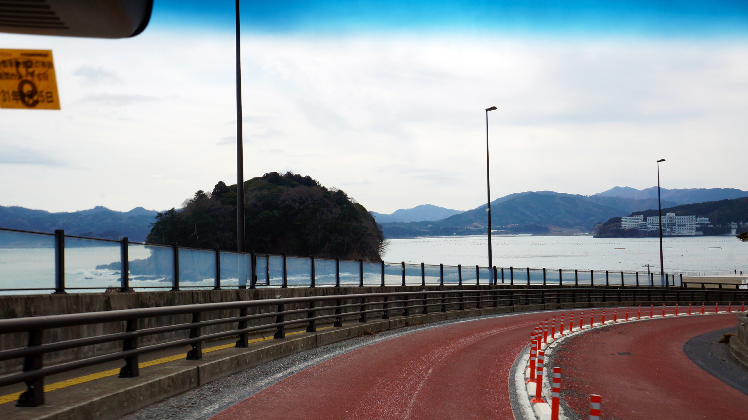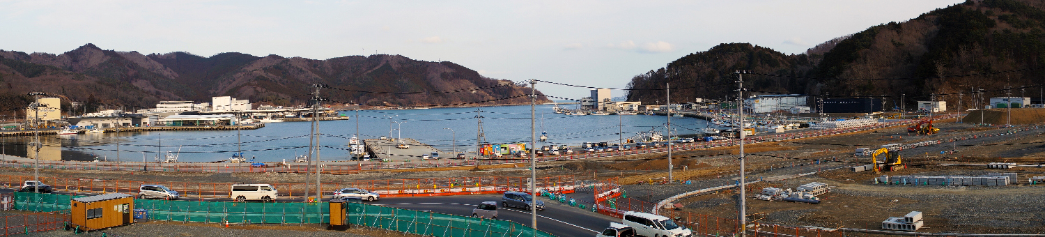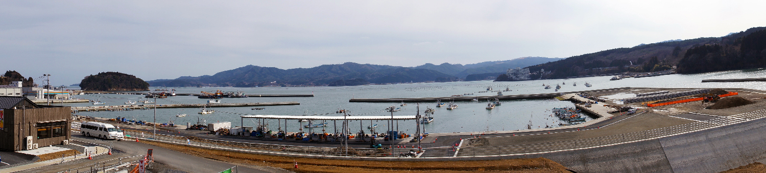 船着き場は整備され船もあるが全体はまだ土山を整備しながら橋を作ったりしてる途中。津波に影響無いような橋をかけるには10m以上も高い位置まであげる必要があり、そのために盛る土の量がもの凄い、工事の進みに相当影響しているように見える。本吉は防潮堤は無いようだ。良くある普通の堤防があって、海にはゴミ1つ浮いていない綺麗なものだった。