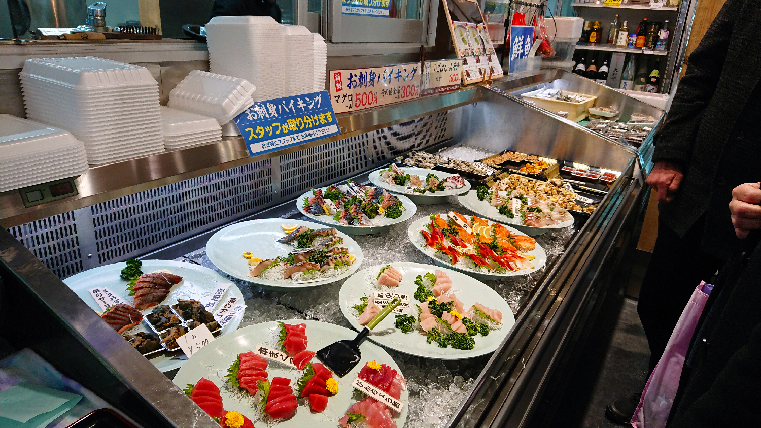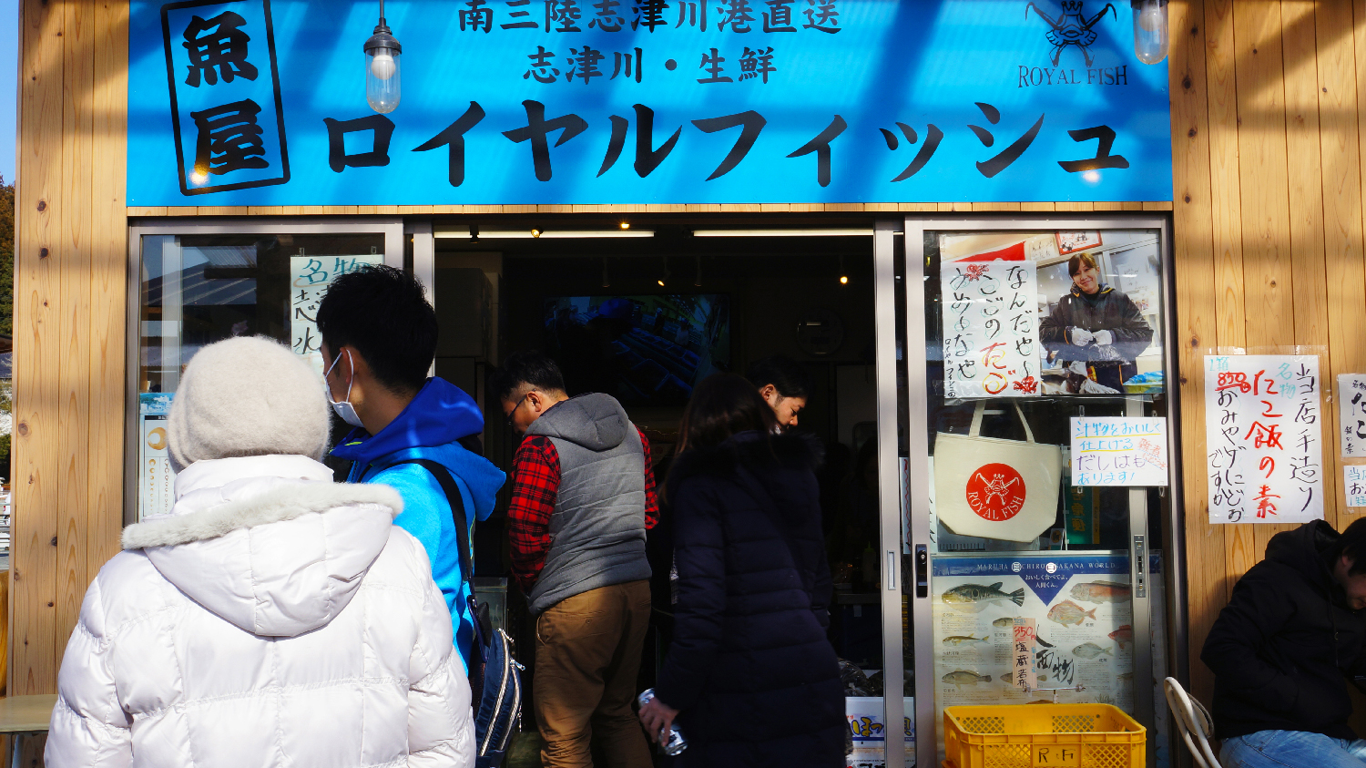海鮮丼や物産が並び、客で賑わっている。外国人の陰はほとんどなかった。