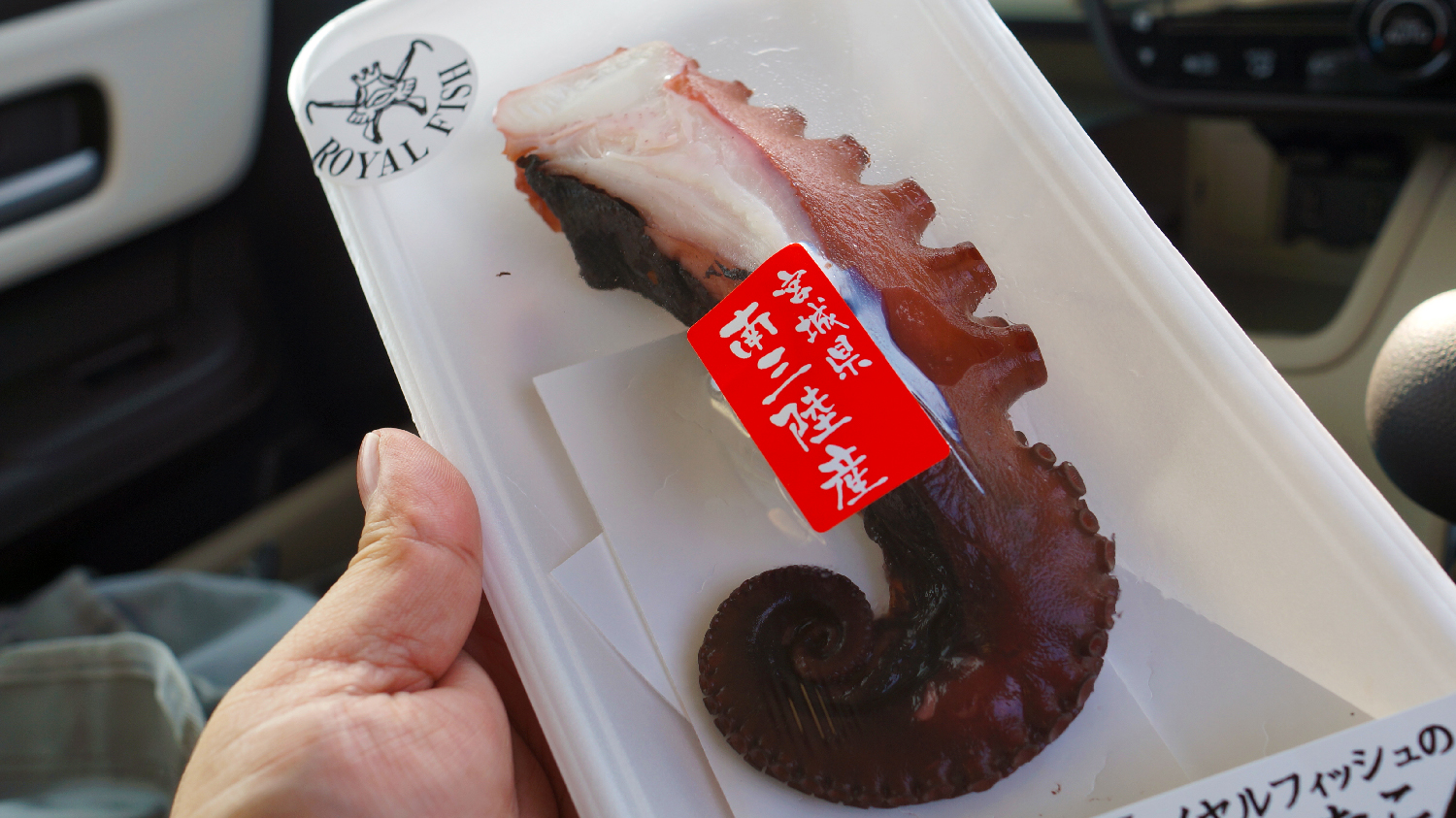 結論としてタコ好きな自分としてはワイルドスタイルを取ることにする。魚貝売り場でタコの足(ボイル)だけを購入し、その場でかぶりつく(笑)これが1番良さがわかるよね。本当に旨い!程よい塩気と噛むほどに旨味、弾力が強くアゴがやられそう。タコをモグモグしながら、車で南下し女川湾を目指す。