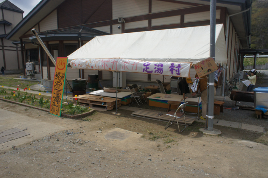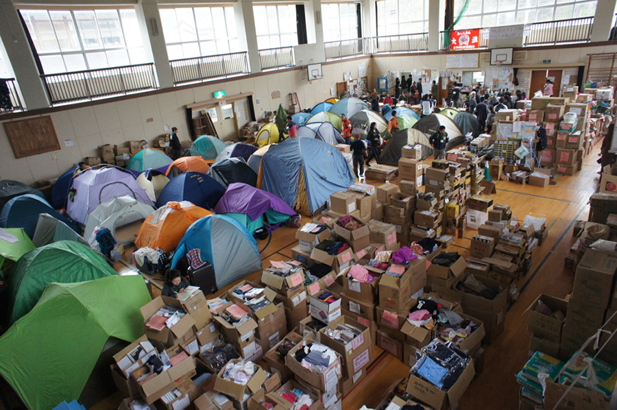 体育館は物資で埋まり、毎日搬入搬出。足湯のあった場所や避難所。