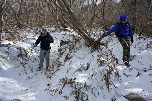 避難小屋から下ると、雪が相当残っている、積雪は10〜15cm。