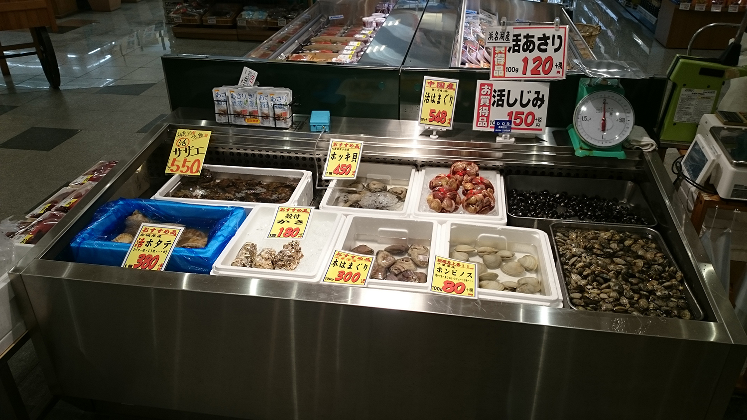椎茸、青菜系は安い。中には地元以外のものが売ってたり、強気な値段のものもあるので要注意。他の食材は「おかじま」で色々買うがメインの肉だけ、納得いくものがなかった。仕方ないのでもう1軒地元で評判の良いスーパー「りゅうきょう」へ。肉を求めに来たのにココは魚天国だった、大ぶりの切り身、貝類も豊富。肉も量り売りあったり馬肉あったりと小さいコーナーながら充実していたので次回はこのスーパーだけで十分だ。