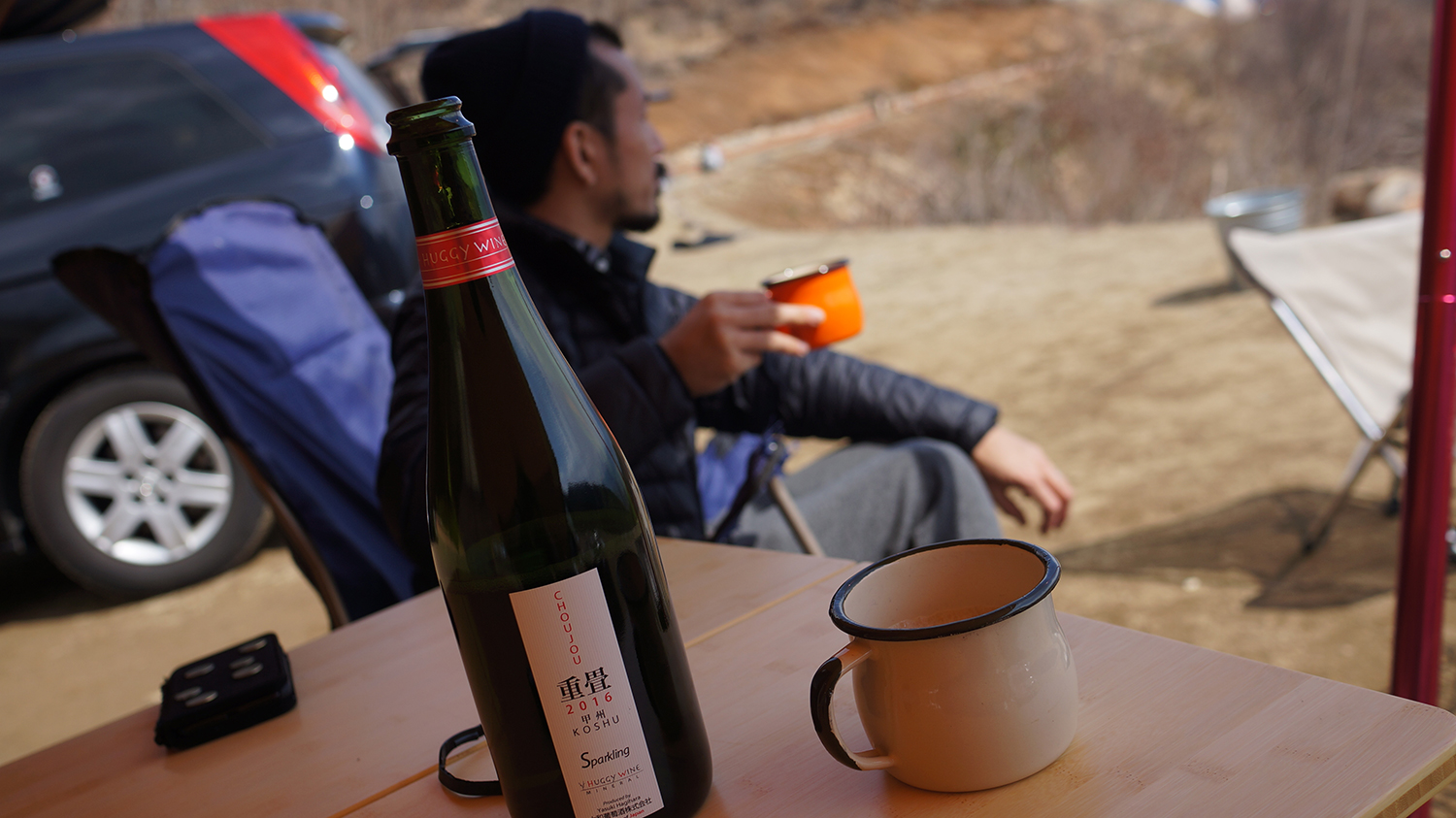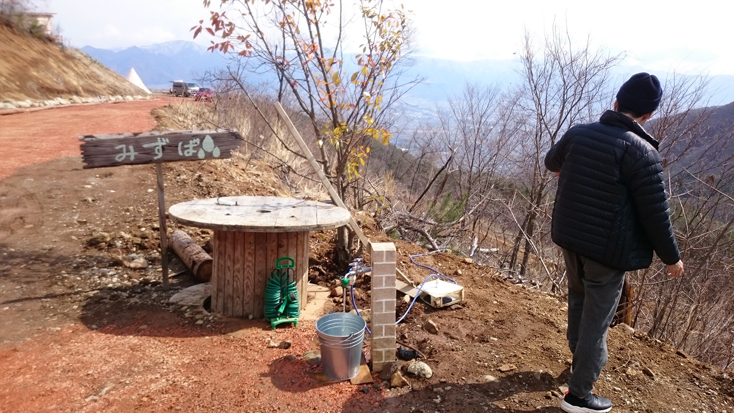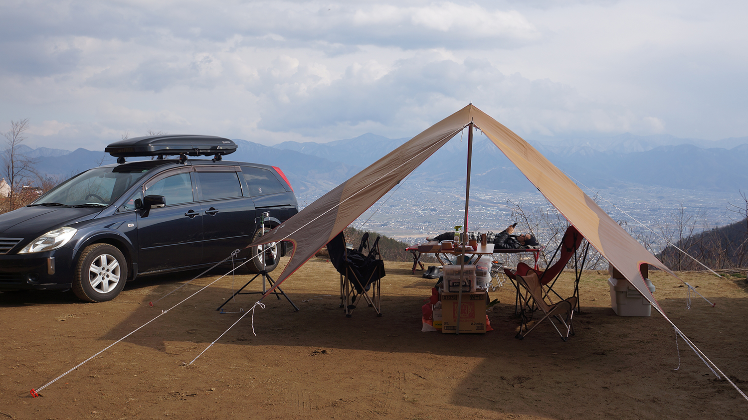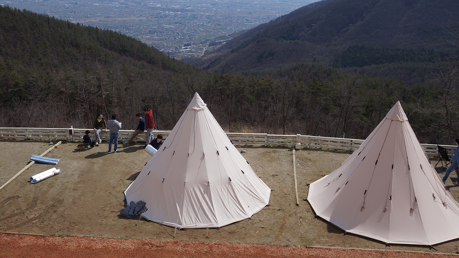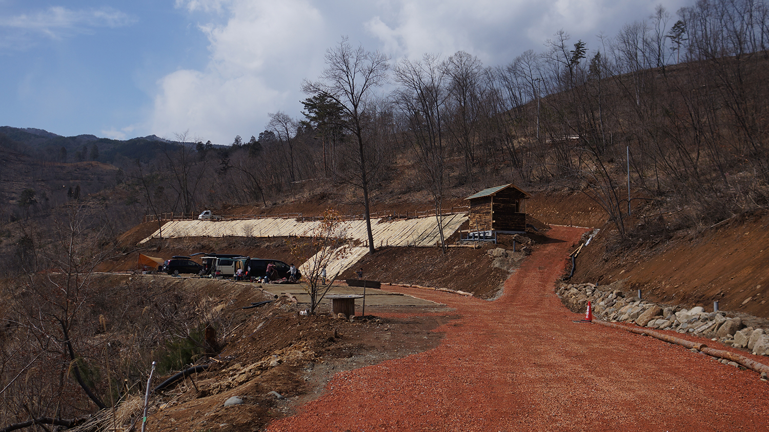 そうこうしているうちにAM11時、なるべく長い時間いるために早めのチェックインをする。山梨では有名な展望温泉の奥に最近できたばかりのキャンプ場。市街地を見下ろし、山々の壮大な景色。なによりも富士山が見える大展望キャンプサイトなのだ。林地を舗装、土道に砂利を巻いて整備している。