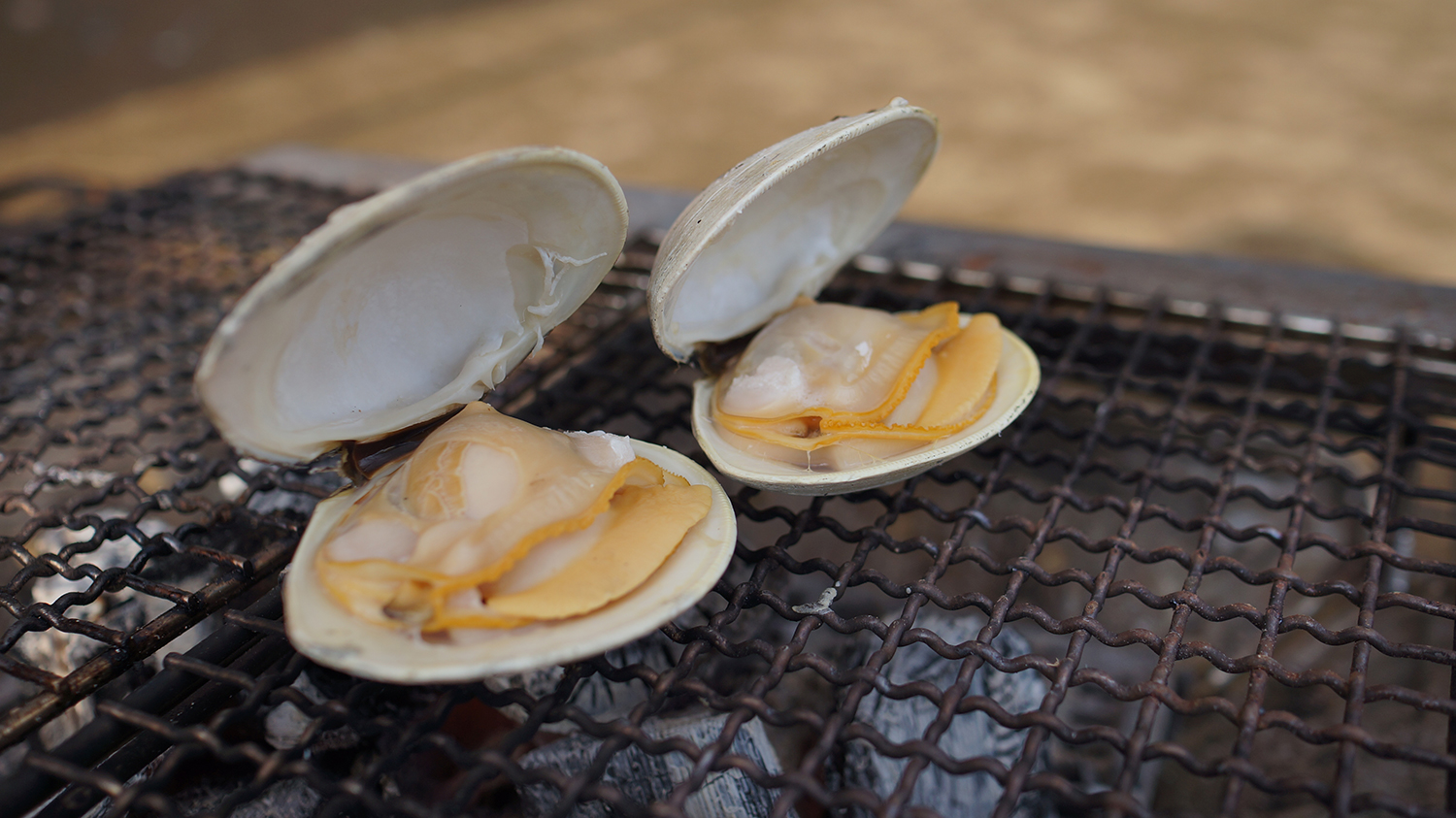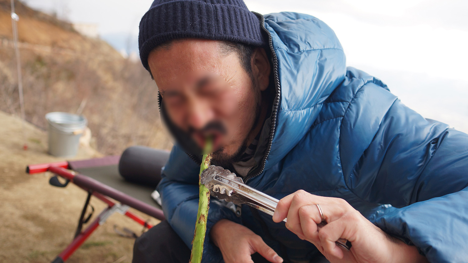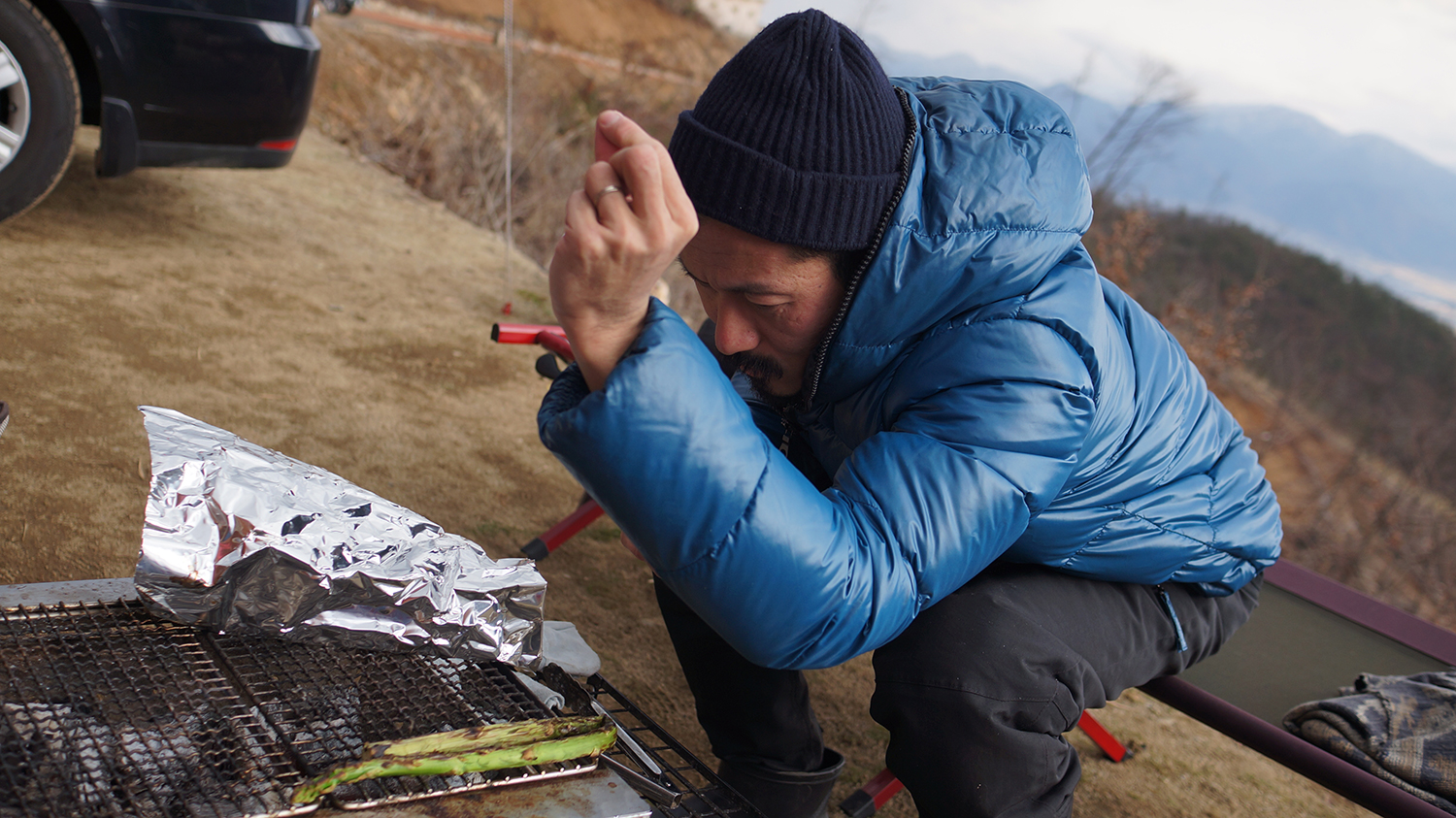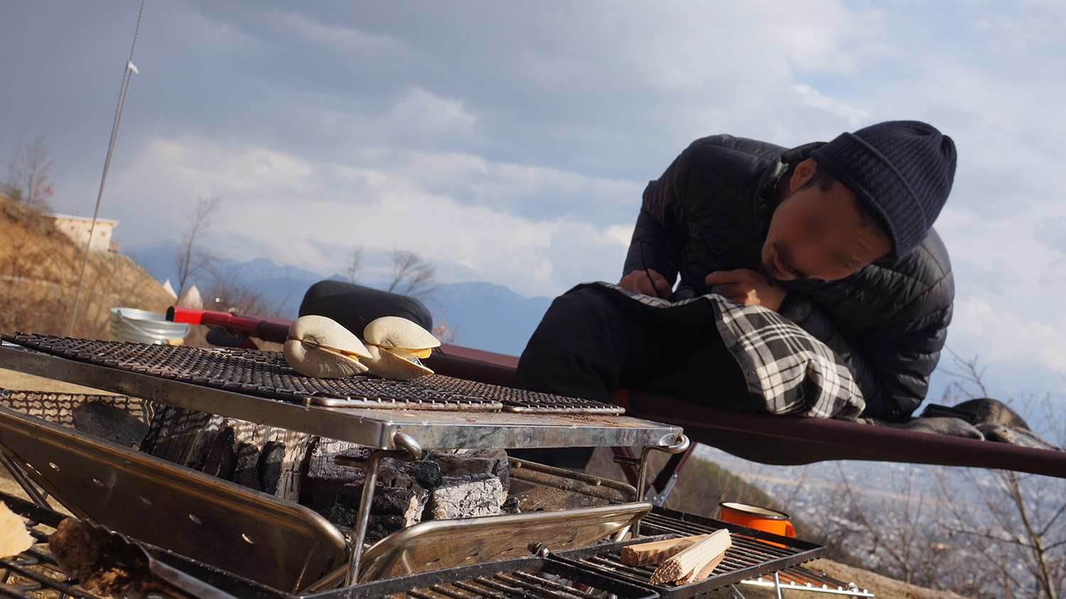 炭火の着火はいつも通り西岡式で放置着火。待つ時間は大展望&太陽の下で横になり、山梨だけに甲州ワインのスパークリングで乾杯! もう至福ね。さて、火加減はどうかな〜という具合に貝を焼き、ロングアスパラを焼き、定番のピーマン丸焼き。