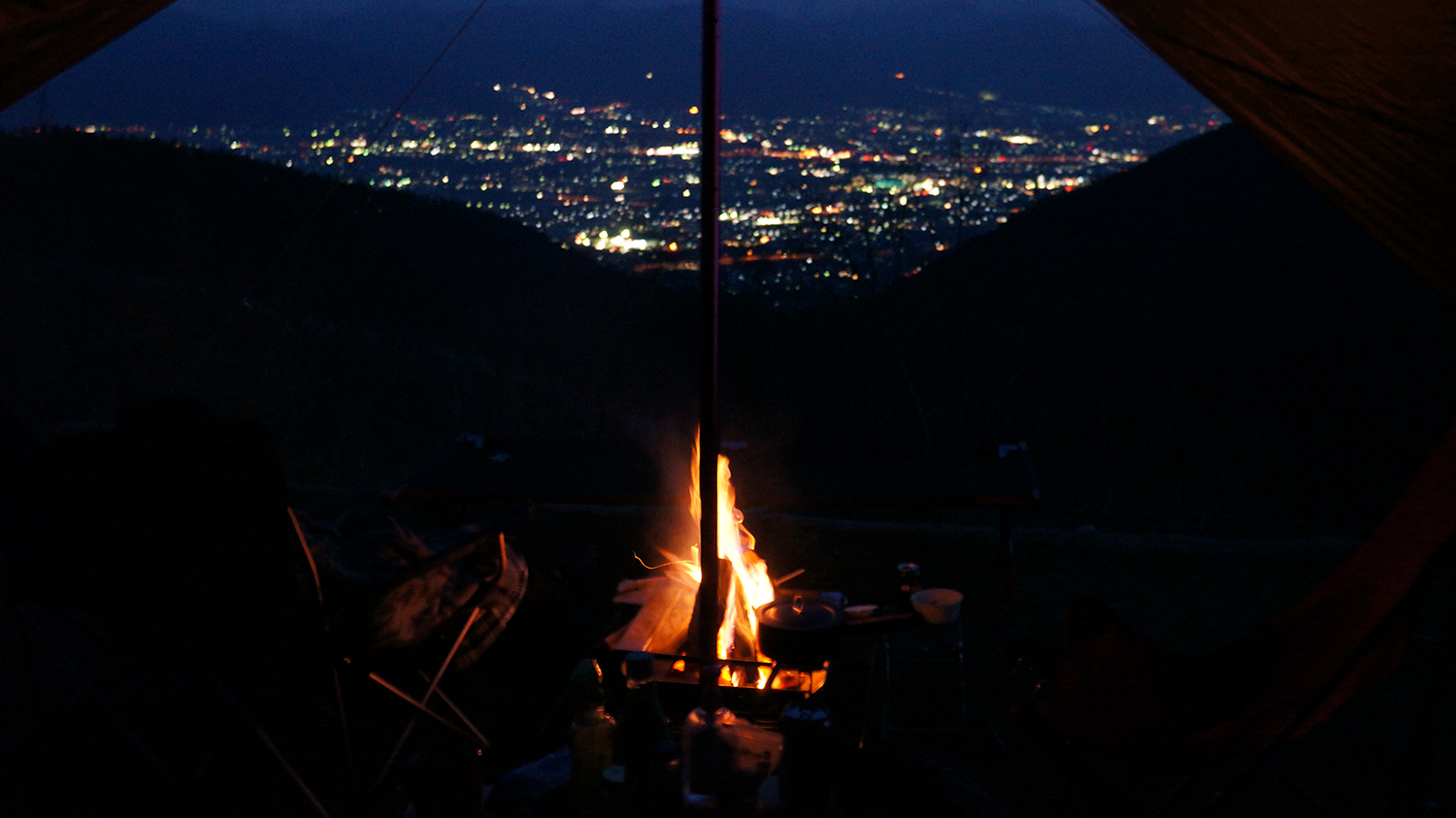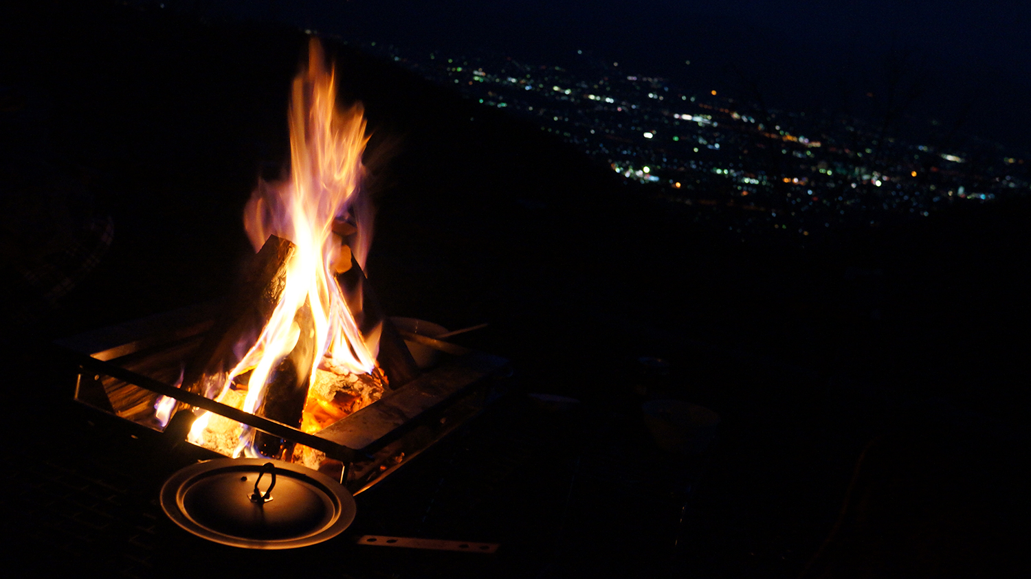 まぁ何ともフォトジェニックだこと、焚き火越しの夜景! これは本当に今までに見たことない光景で。