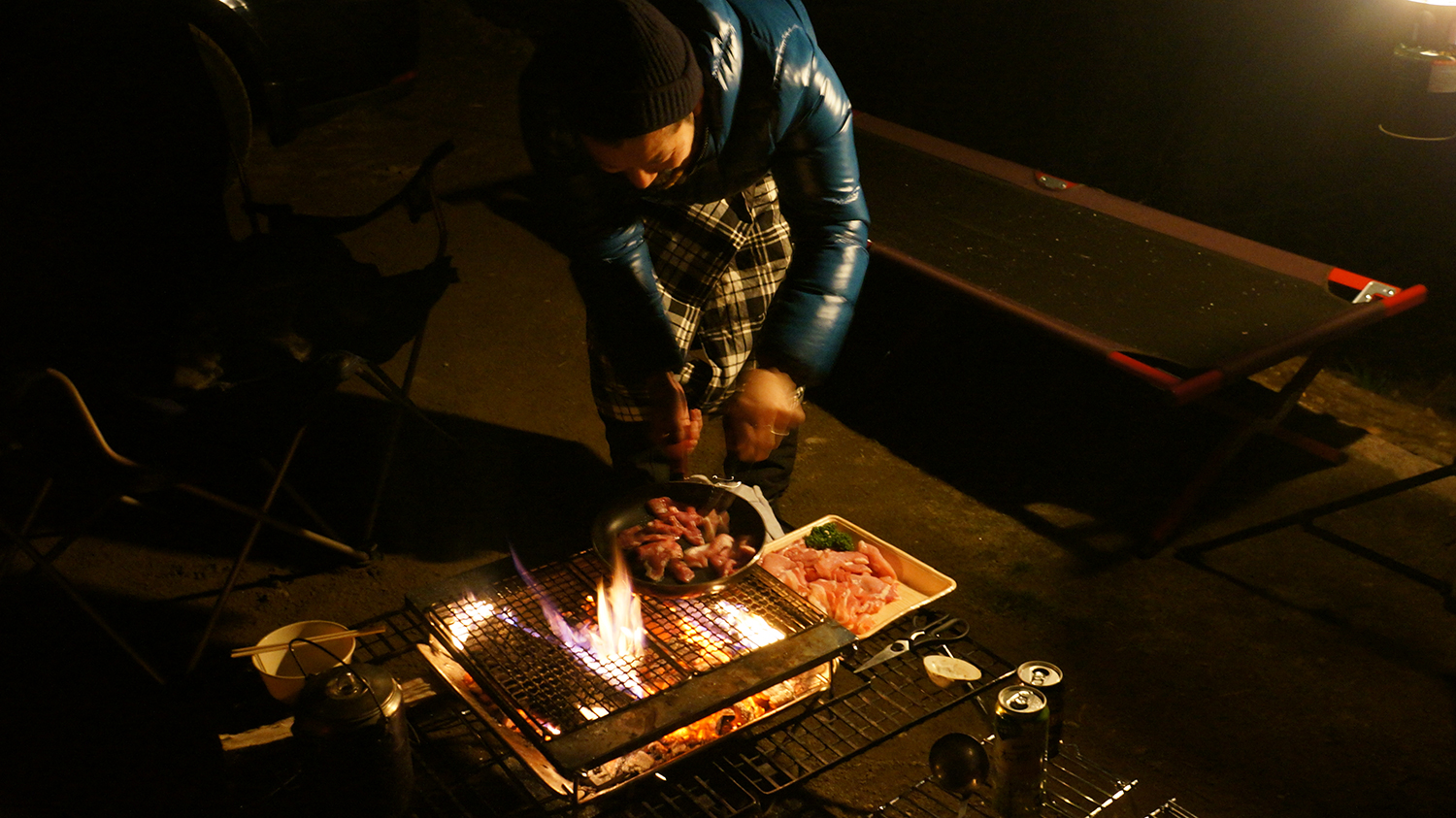 サイトに戻ると他も就寝して静寂の時間。程よく焚き火を起こし酒タイム。つまみを炙り、ウイスキーを味わう大人タイム。