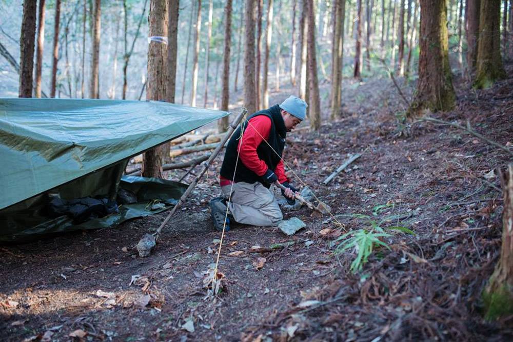 今回は野郎2人なのでシェルターは無し、いままでシェルターにオプションで付ける専用のタープを単品で設営してみたいという目的があったのでトライ。しかし元々単体での設置を想定した商品ではないので張り方に四苦八苦….すべての設営まで1hくらい掛かってしまったが上々なサイトになった。予想最低気温は-3℃くらい、山の谷なので風が強かったらもっと強靱な設営をしないと飛ばされたり寒さ対策もする必要があるので天候を考慮することが重要なキャンプ場かもしれない。