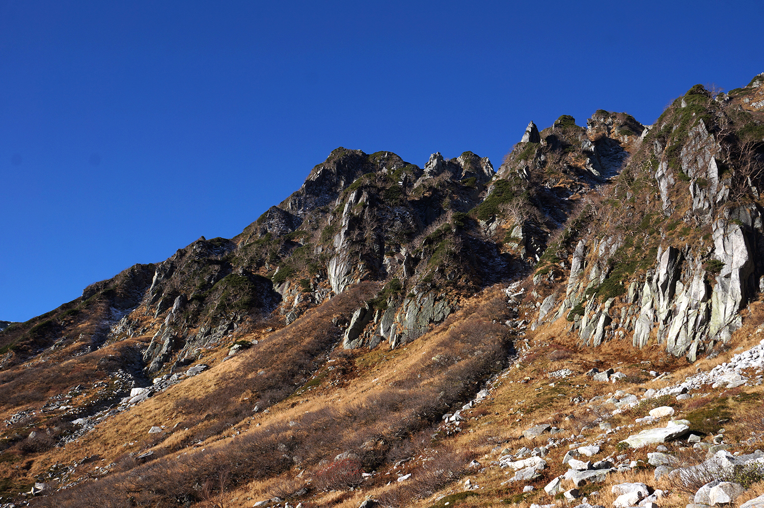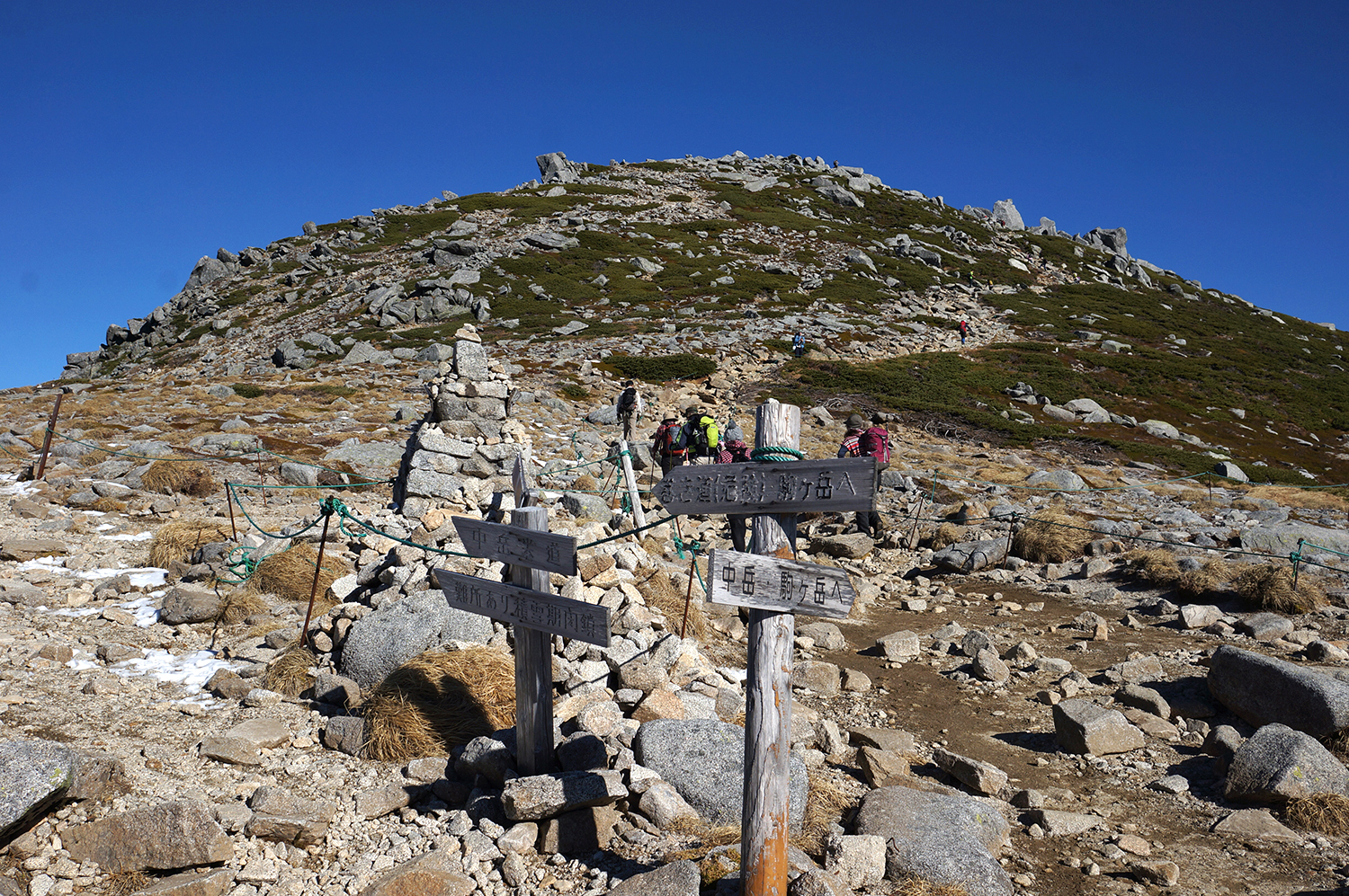 来た道を戻り乗越浄土へ、そこから鎖場のある宝剣岳へ。