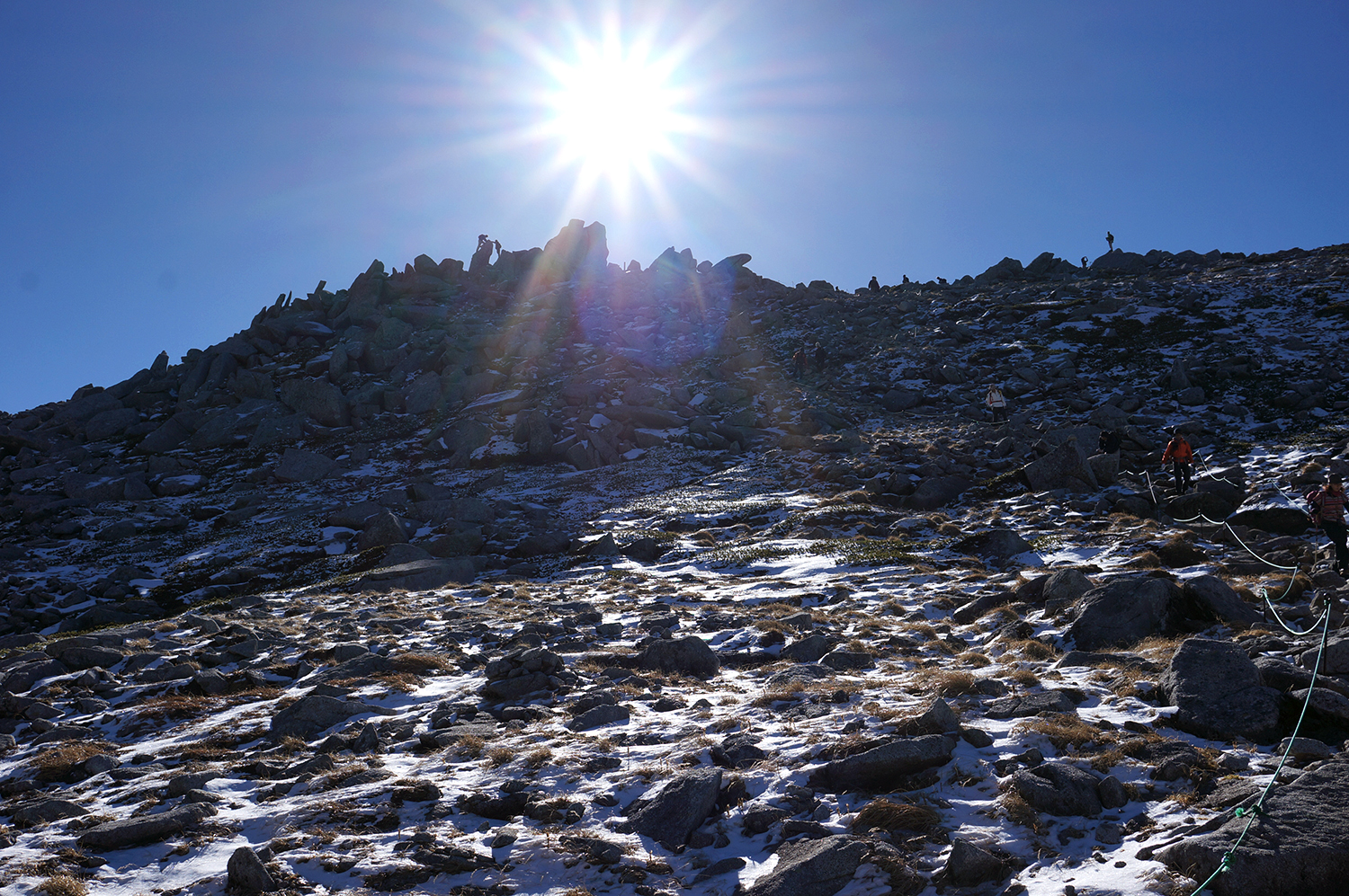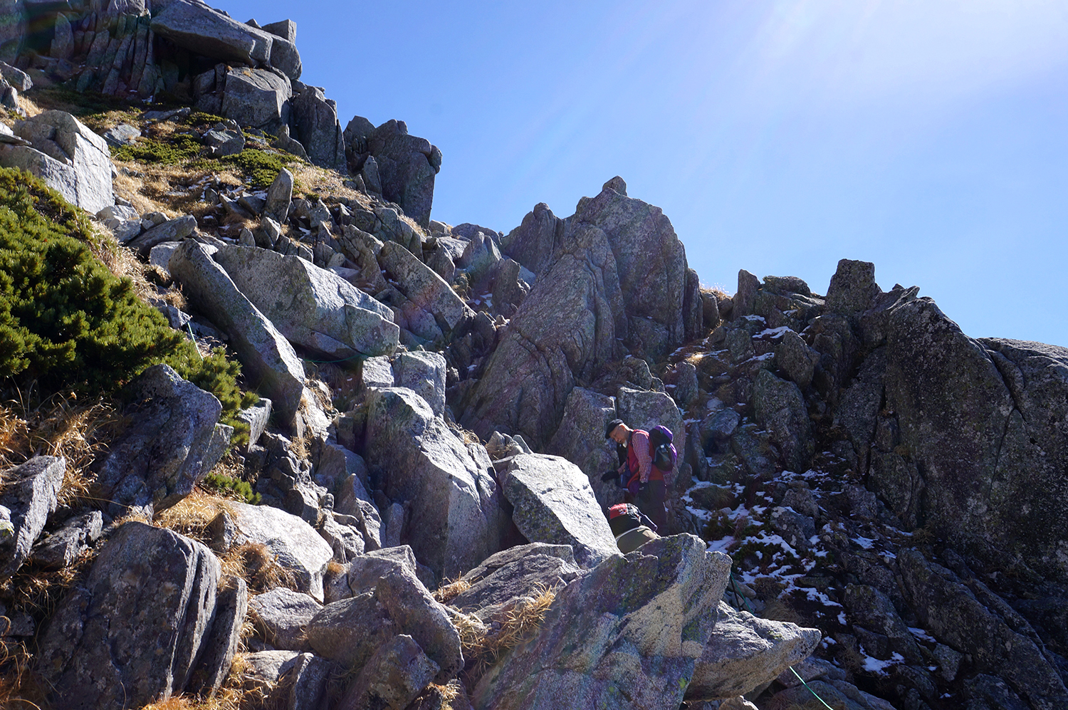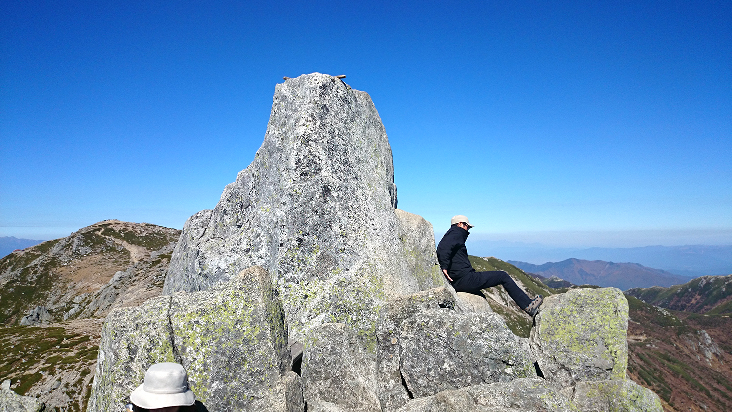 わかりづらいけど、切り立った岩のてっぺんに、人が1人乗れる程度の先端を目指す。日陰にはアイスバーンが残るし、足場も狭い、絶壁なので絶対に落ちるわけにはいかない。この駒ヶ岳でも滑落事故の多い場所で1番の難所。